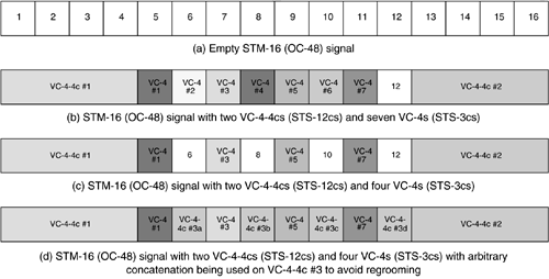 To get around these restrictions, some manufacturers of framers, that is, the hardware that processes the SDH multiplex section layer (SONET line layer), offer a capability known as “flexible” or arbitrary concatenation. With this capability, there are no restrictions on the size of an STS-Nc (VC-4-Xc) or the starting time slot used by the concatenated signal. Also, there are no constraints on adjacencies of the STS-1 (VC-4-Xc) time slots used to carry it, that is, the signals can use any combination of available time slots. Figure 3-2 depicts how the sequence of signals carried over the STM-16 of Figure 3-1 can be accommodated without any regrooming, when the arbitrary concatenation capability is available.