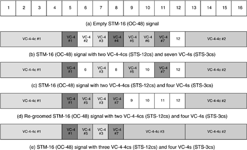 In Figure 3-1(a), an STM-16 (OC-48) signal is represented as a set of 16 time slots, each of which can contain a VC-4 (STS-3c SPE). Let us examine the placement of VC-4 and VC-4-4c (STS-3c and STS-12c SPE) signals into this structure, in line with the rules above. In particular a VC-4-4c (STS-12c SPE) must start on boundaries of 4. Figure 3-1(b) depicts how the STM-16 has been filled with two VC-4-4c (STS-12c) and seven VC-4 signals. In Figure 3-1(c), three of the VC-4s have been removed, that is, are no longer in use. Due to the placement restrictions, however, a VC 4-4c cannot be accommodated in this space. In Figure 3-1(d), the STM-16 has been “regroomed,” that is, VC-4 #5 and VC-4 #7 have been moved to new timeslots. Figure 3-1(e) shows how the third VC-4-4c is accommodated.