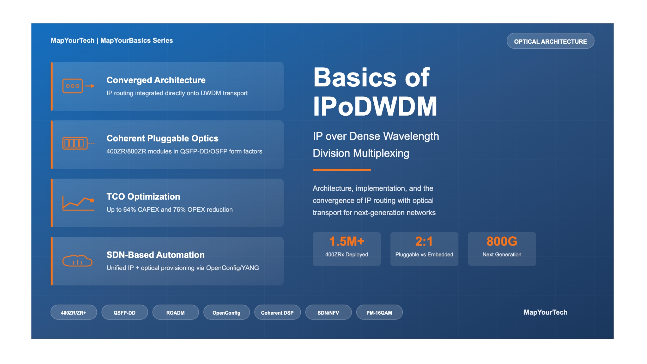 Strategic Importance: IPoDWDM is not merely a technical evolution but a strategic imperative for the telecommunications industry. Early adopters have reported up to 64% reduction in CAPEX and 76% decrease in OPEX, making it one of the most impactful architectural transformations available to network operators.
