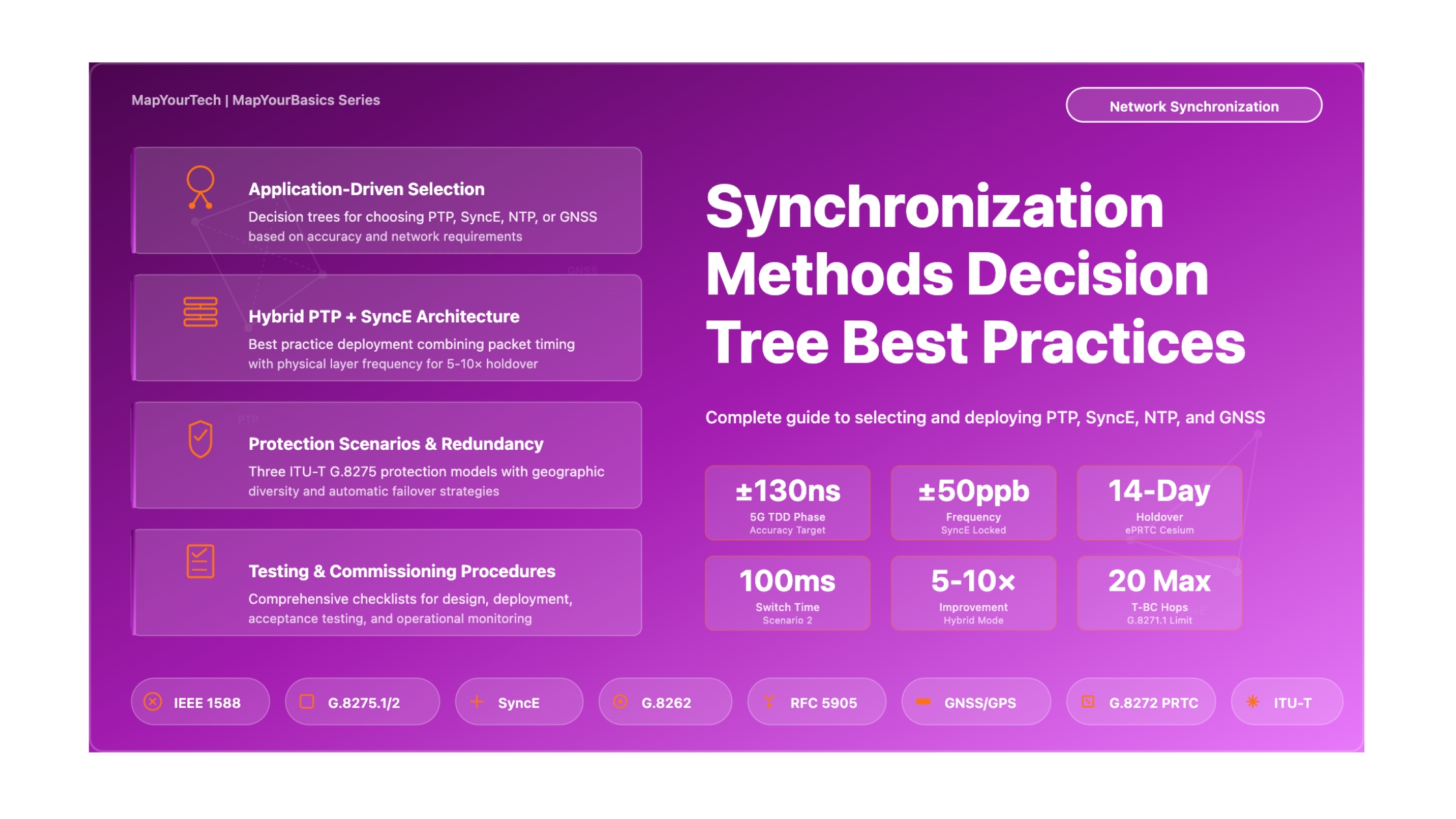The guidance presented here synthesizes requirements from ITU-T Recommendations G.8271 through G.8275.2, IEEE 1588-2019, and operational experience from carrier-grade network deployments. The focus extends beyond simple technology comparison to address practical implementation challenges including holdover requirements, protection switching strategies, oscillator selection, and the critical tradeoffs between capital expenditure, operational complexity, and timing accuracy.