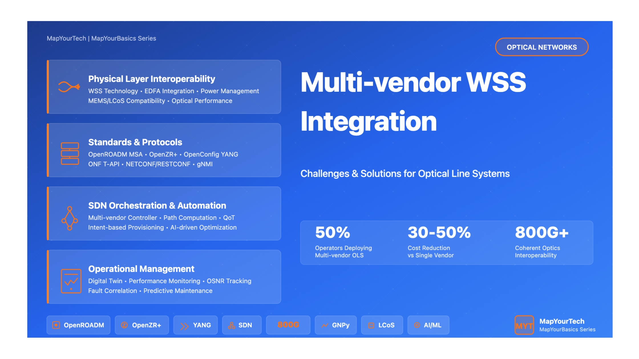 3. Physical Layer Complexity Remains: WSS technology differences (MEMS vs LCoS), amplifier gain profile variations, and power level coordination across vendor boundaries require sophisticated engineering and conservative margins.