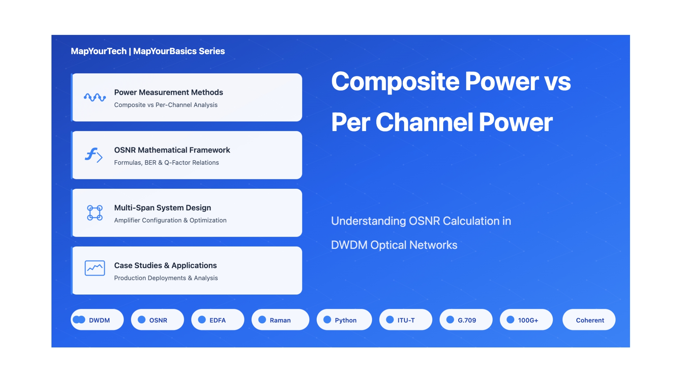 Key Mathematical Insight: The OSNR formula fundamentally requires per channel power because ASE noise from optical amplifiers is distributed across the entire optical bandwidth, while signal power exists only at specific channel wavelengths. The noise power per unit bandwidth is constant, but signal power varies by channel.