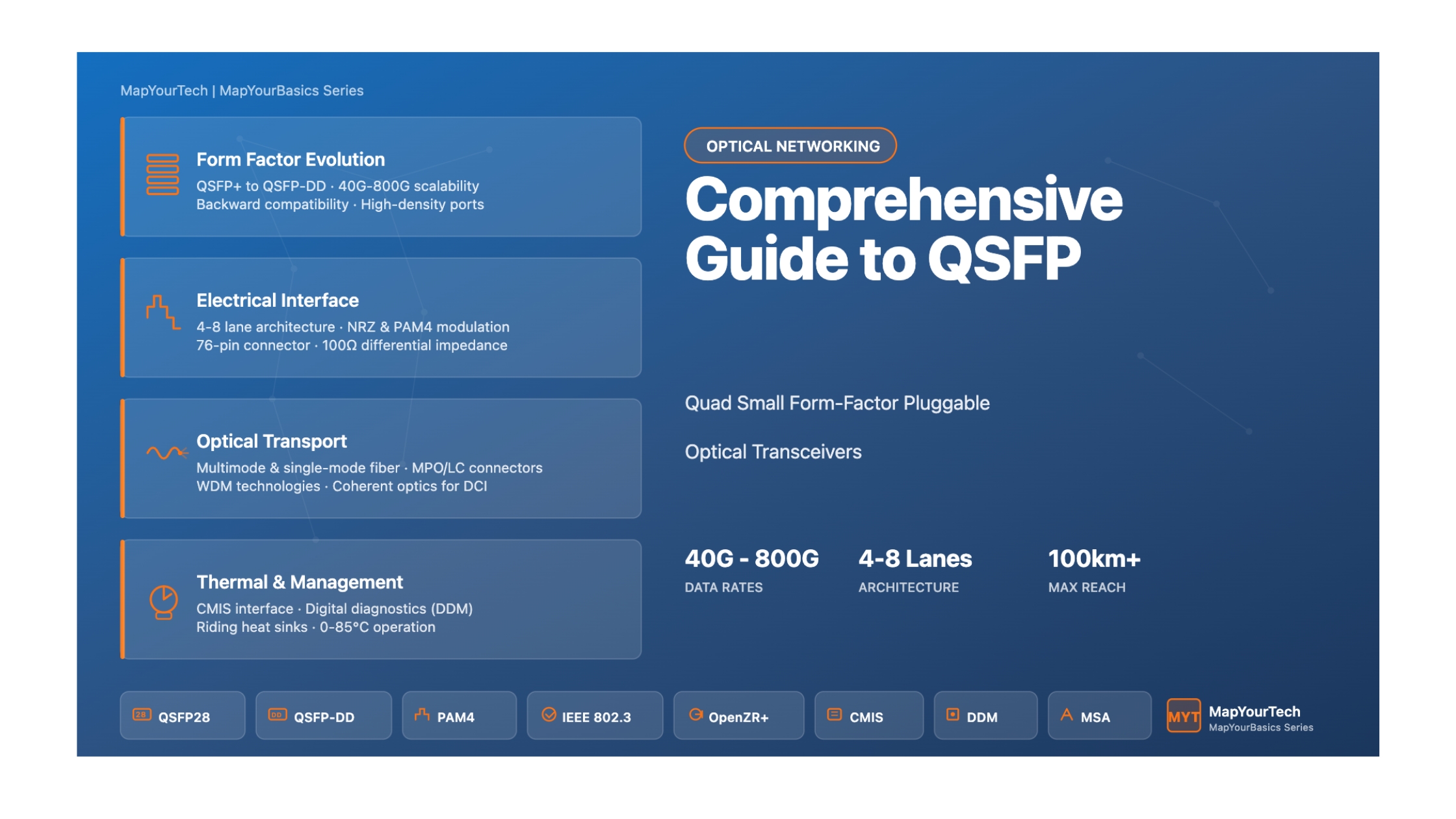 The QSFP family has evolved through several generations, each offering increased data rates while maintaining backward compatibility where possible. This document provides comprehensive technical information about QSFP technology, covering specifications, applications, thermal management, and implementation considerations.
