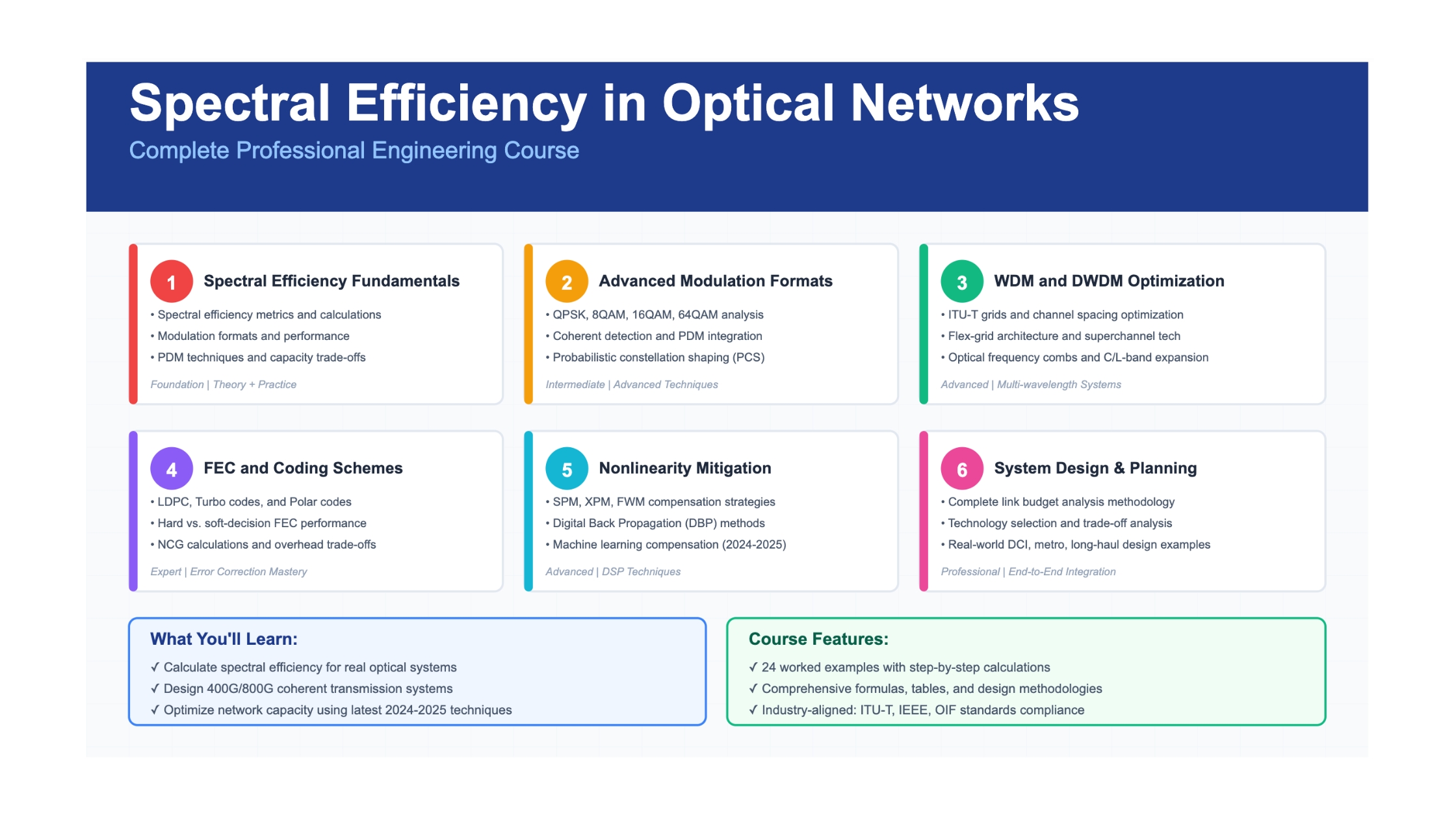 Spectral Efficiency in Optical Networks A Comprehensive Professional Engineering Course 6 Chapters 42 Sections 24 Assessments 24 Examples About This Course This professional-grade course provides comprehensive coverage of spectral efficiency...