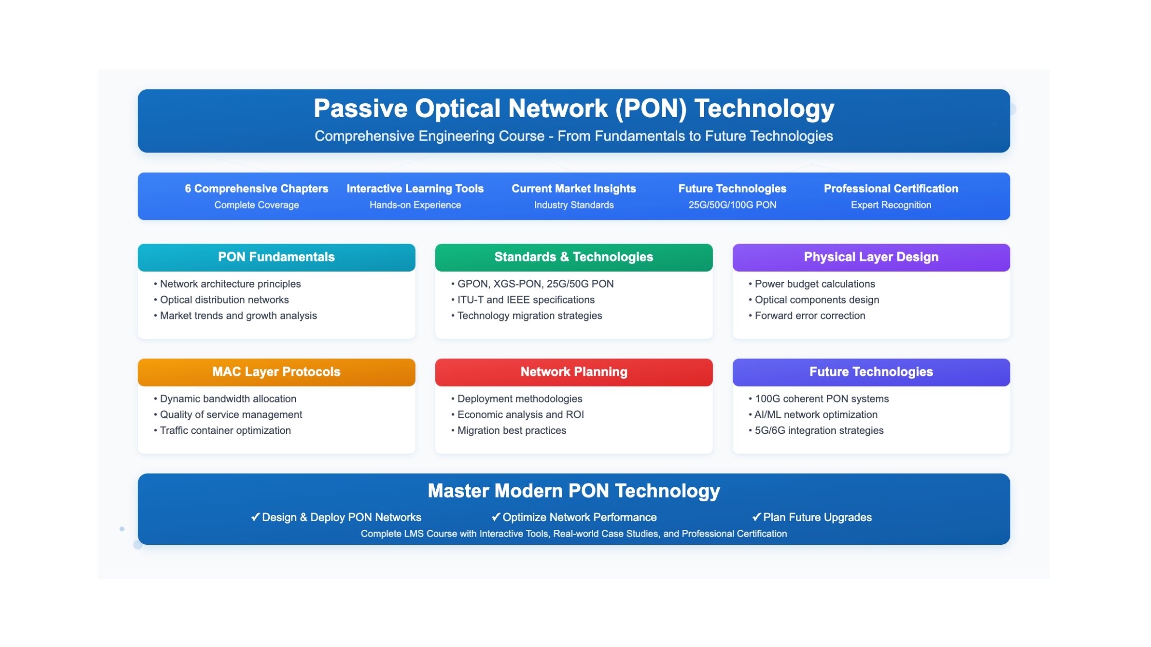 Learning Objectives Understand the fundamental concepts and principles of Passive Optical Networks Analyze the evolution of optical access networks from copper to fiber technologies Compare PON architectures with traditional point-to-point...