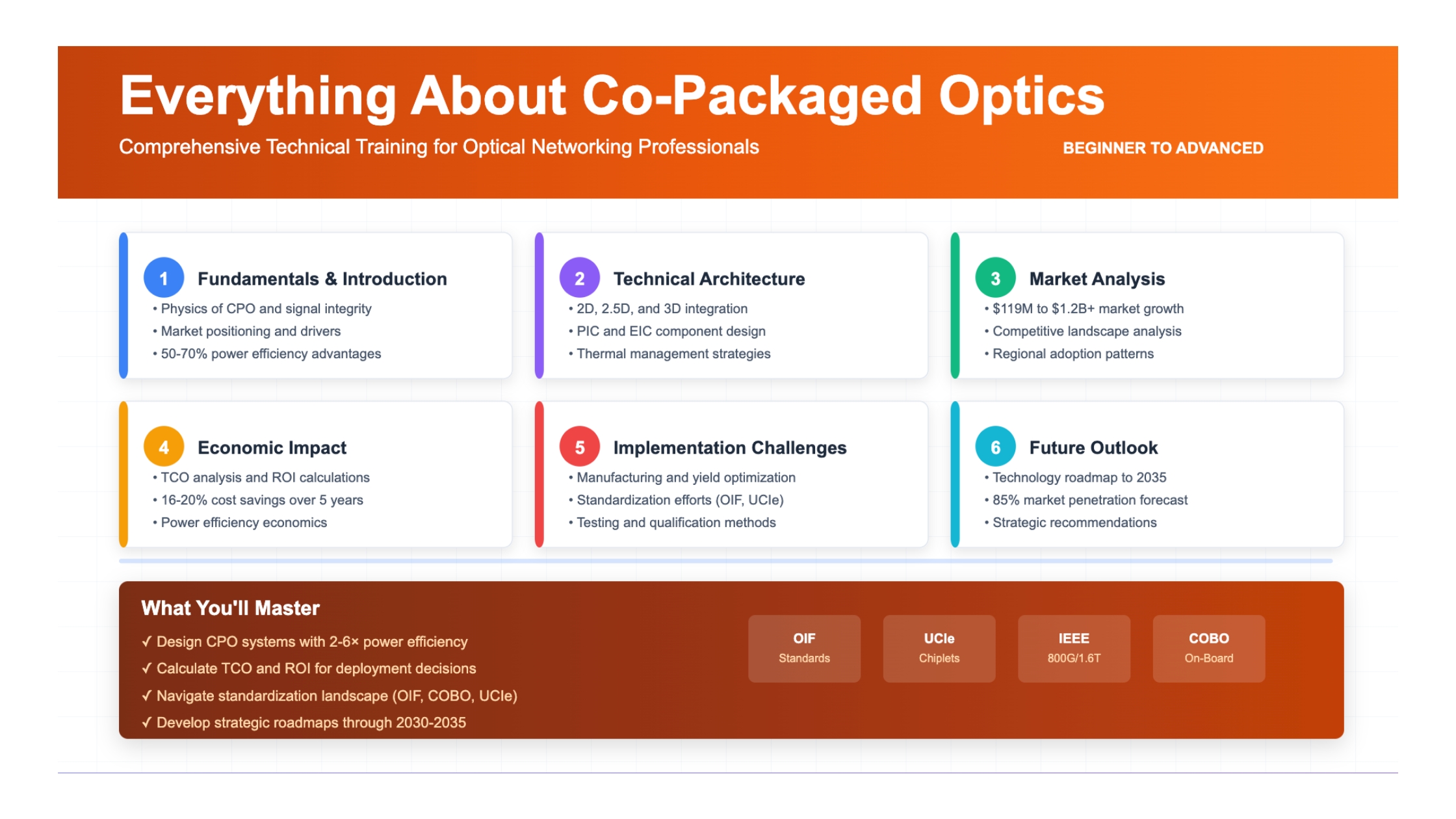 Learning Objectives Define co-packaged optics (CPO) and explain its fundamental principles Compare and contrast CPO with traditional pluggable optical transceivers Analyze the technological drivers necessitating CPO adoption Evaluate the basic...