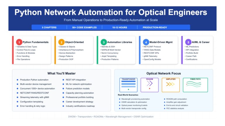 Course Overview Duration: 4 weeks Level: Beginner Prerequisites: Basic knowledge of optical networks and macOS Course Description This course introduces optical network engineers to automation concepts and practical implementation using...