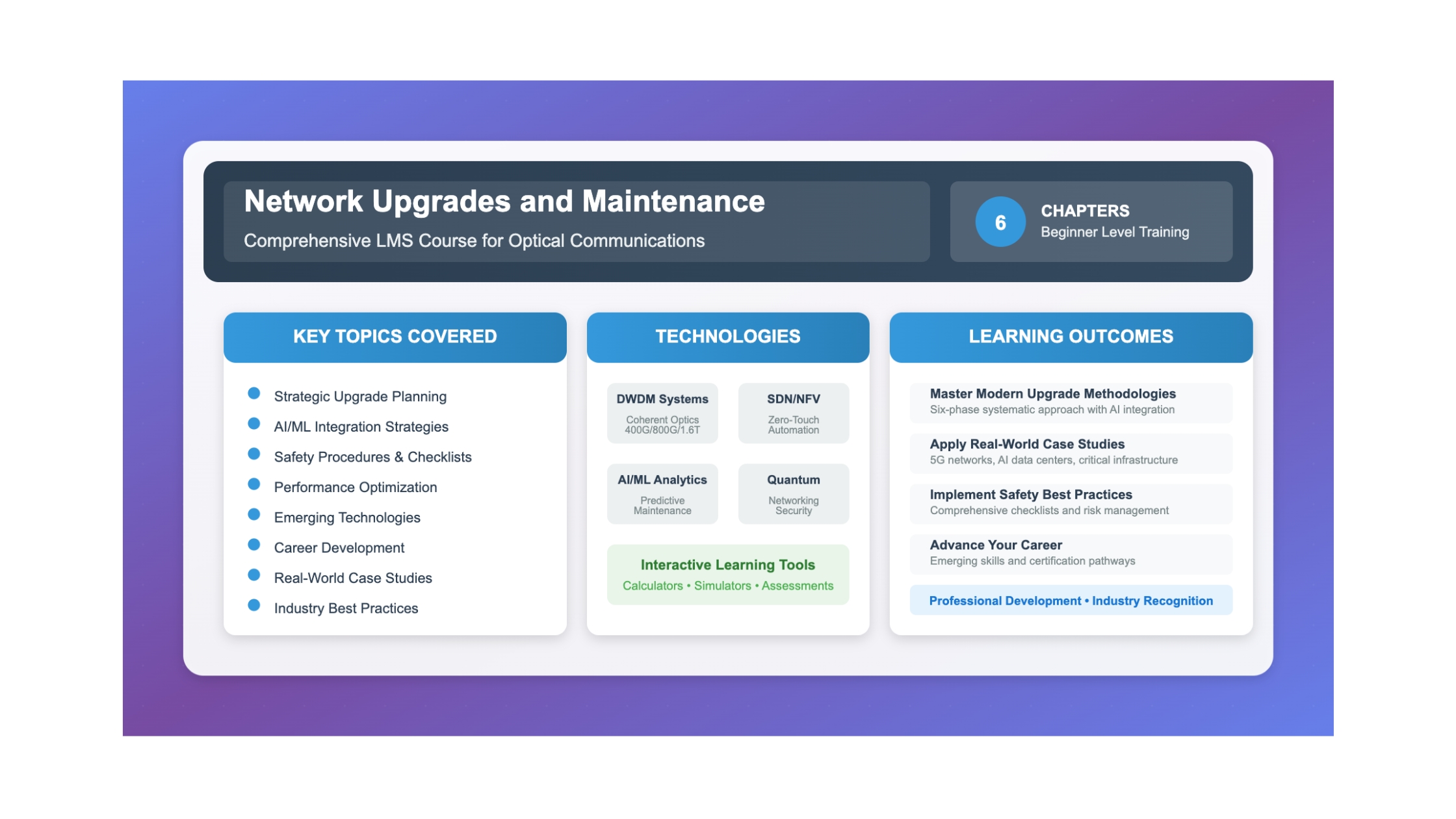 Learning Objectives Understand the fundamental principles and drivers of network upgrades in modern optical communications Analyze capacity requirements, technology advancements, and cost-benefit considerations for upgrade decisions Evaluate compatibility, interoperability, and...