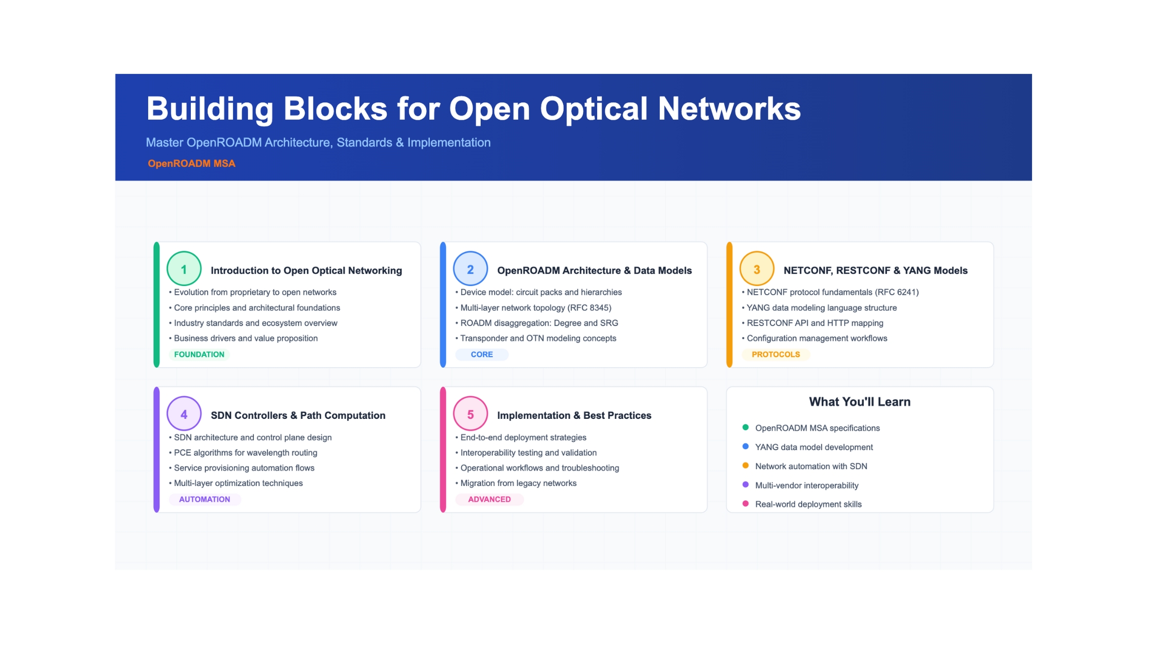 Learning Objectives Understand the evolution from traditional vendor-locked optical networks to open, disaggregated architectures Comprehend the fundamental principles and value proposition of open optical networking Analyze the key components and...