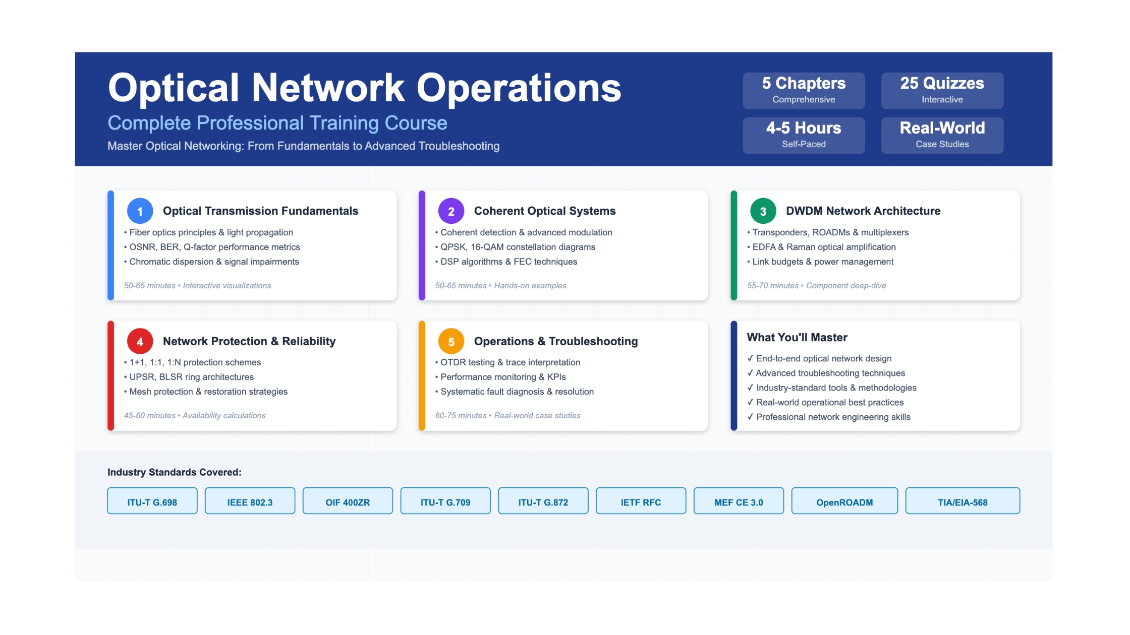Optical Network Operations Course Overview – MapYourTech Optical Network Operations and Troubleshooting Complete Professional Training Course Master optical networking from fundamentals to advanced operations in 5 comprehensive chapters 5 Comprehensive...