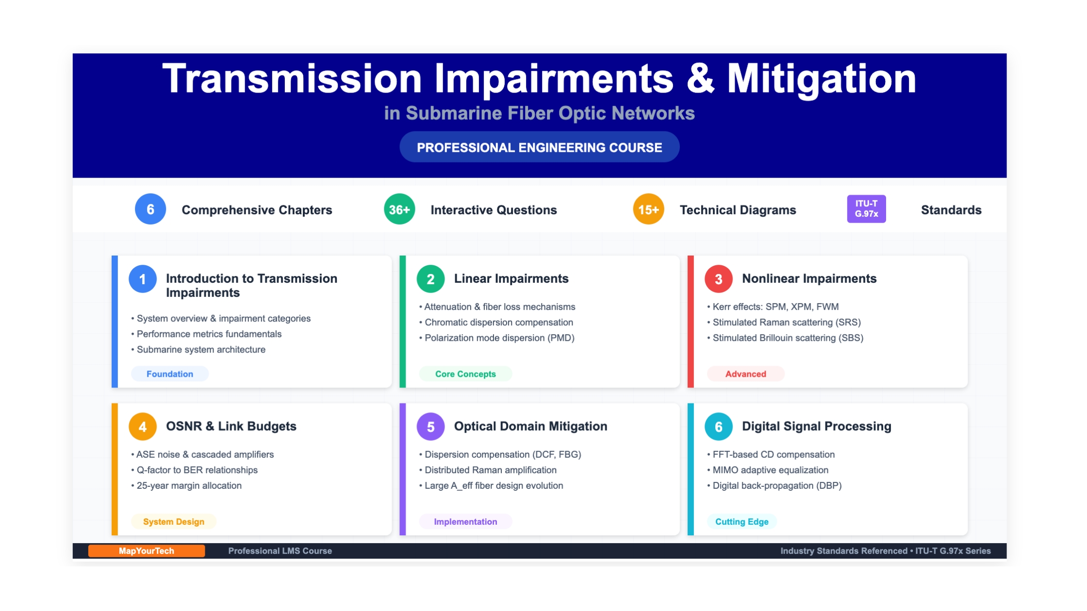 Transmission Impairments and Mitigation in Submarine Fiber Optic Networks Course Overview This comprehensive LMS course provides a complete technical foundation in submarine fiber optic transmission systems, covering the full spectrum...