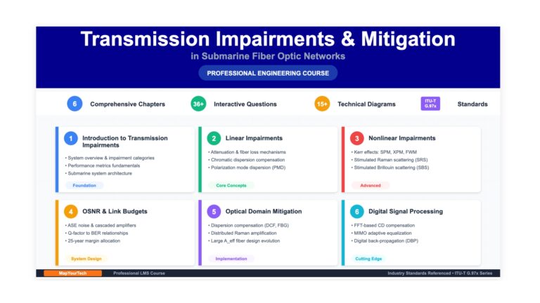 Transmission Impairments and Mitigation in Submarine Fiber Optic Networks Course Overview This comprehensive LMS course provides a complete technical foundation in submarine fiber optic transmission systems, covering the full spectrum...