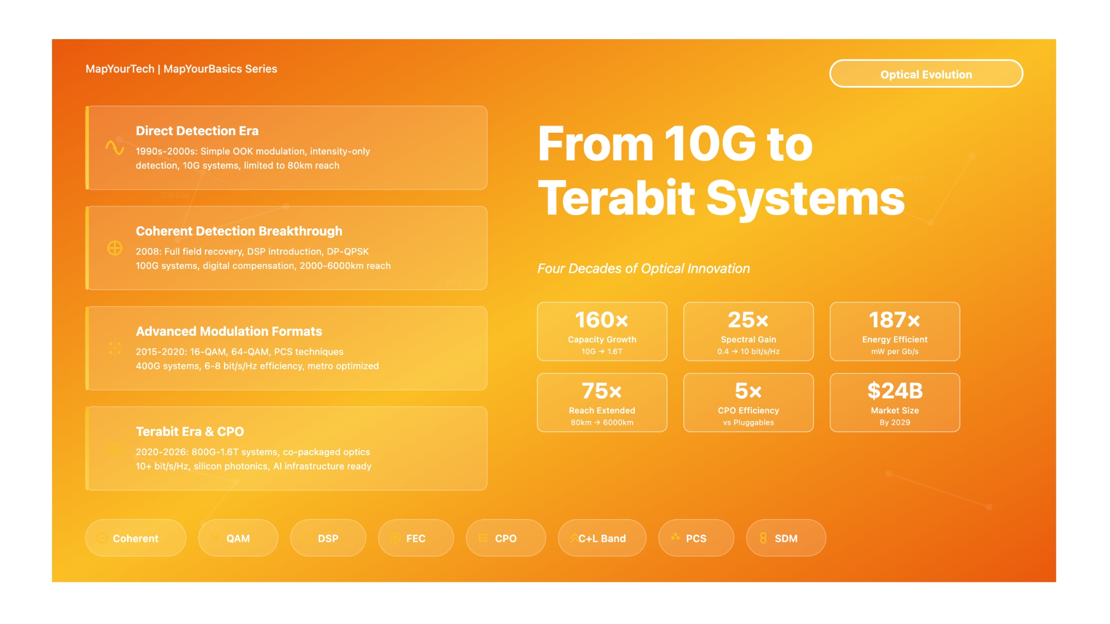 For optical networking professionals in 2026, understanding this evolution - the why, how, and what next - is essential for designing, deploying, and operating modern networks. The technologies that enabled the transition from 10G to Tbps will continue evolving, presenting both challenges and opportunities. Those who master coherent optics, silicon photonics, and advanced DSP techniques will be well-positioned to lead the next phase of optical innovation.