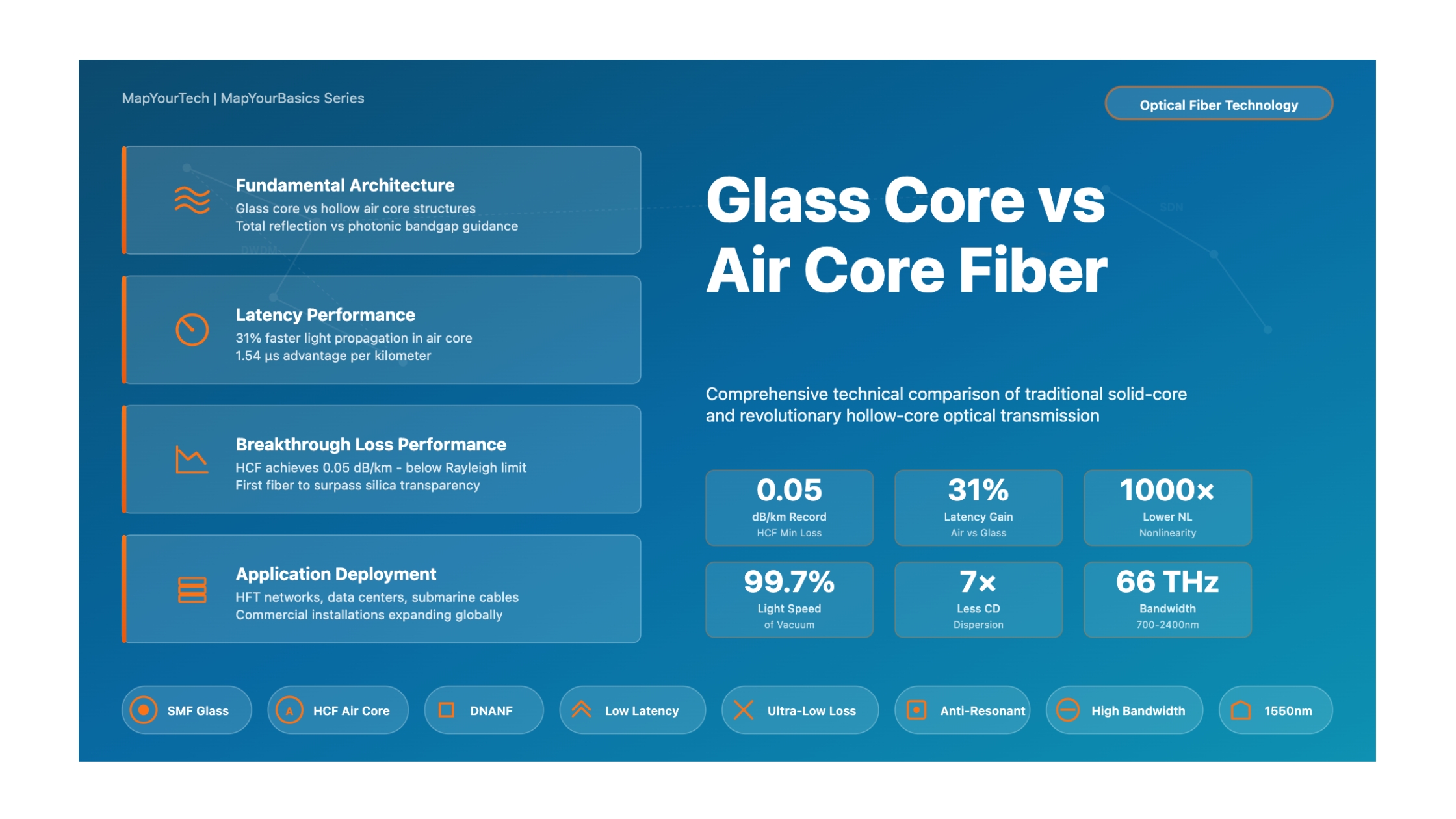 | Propagation Medium | Solid silica glass core with refractive index ~1.45. Light travels through glass at ~200,000 km/s | Air or gas in hollow core (n≈1.0). Light travels at ~300,000 km/s, confined by microstructured glass cladding |