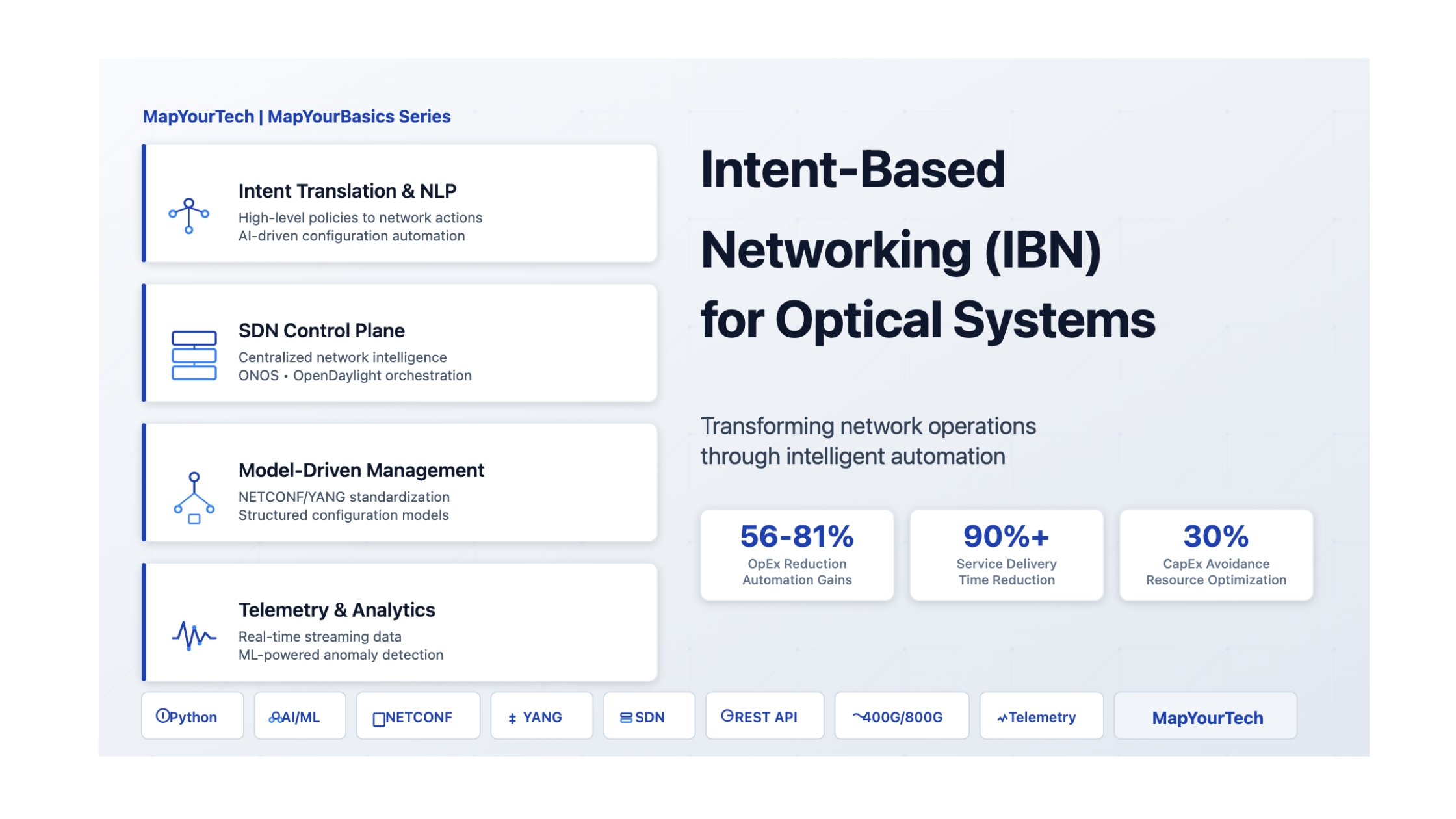 IBN builds upon SDN foundations by adding an abstraction layer that allows operators to define business objectives rather than technical implementations. The system automatically determines how to achieve these objectives by analyzing network topology, capacity, performance metrics, and service level agreements.