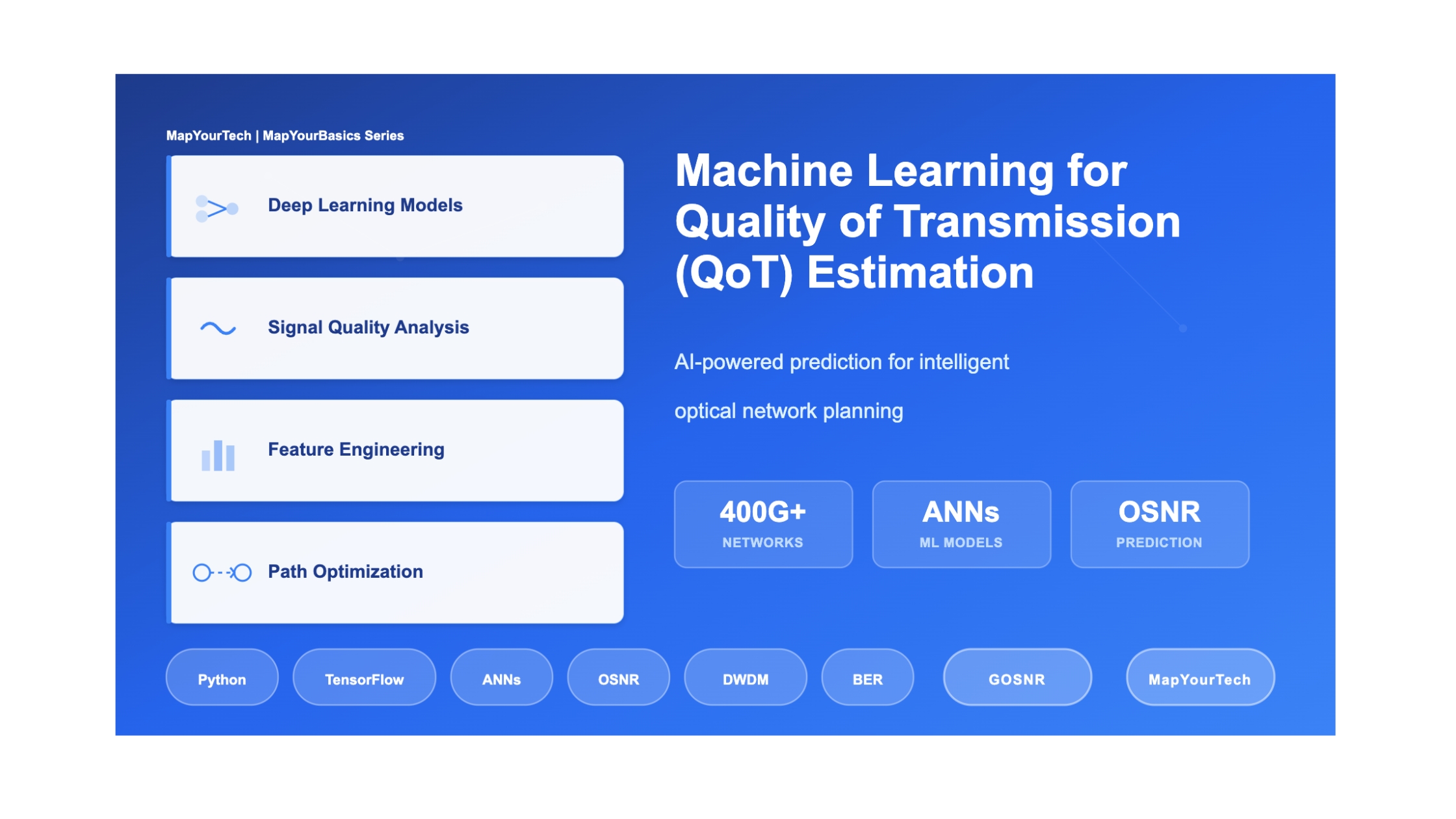 Quality of Transmission (QoT) estimation represents one of the most critical applications of machine learning in modern optical networks. QoT refers to the ability to predict whether a lightpath configuration will meet performance requirements before it is established, enabling intelligent path computation and network optimization. Traditional analytical methods, while valuable, often struggle with the complexity and dynamic nature of modern high-capacity networks operating at 400G and beyond.