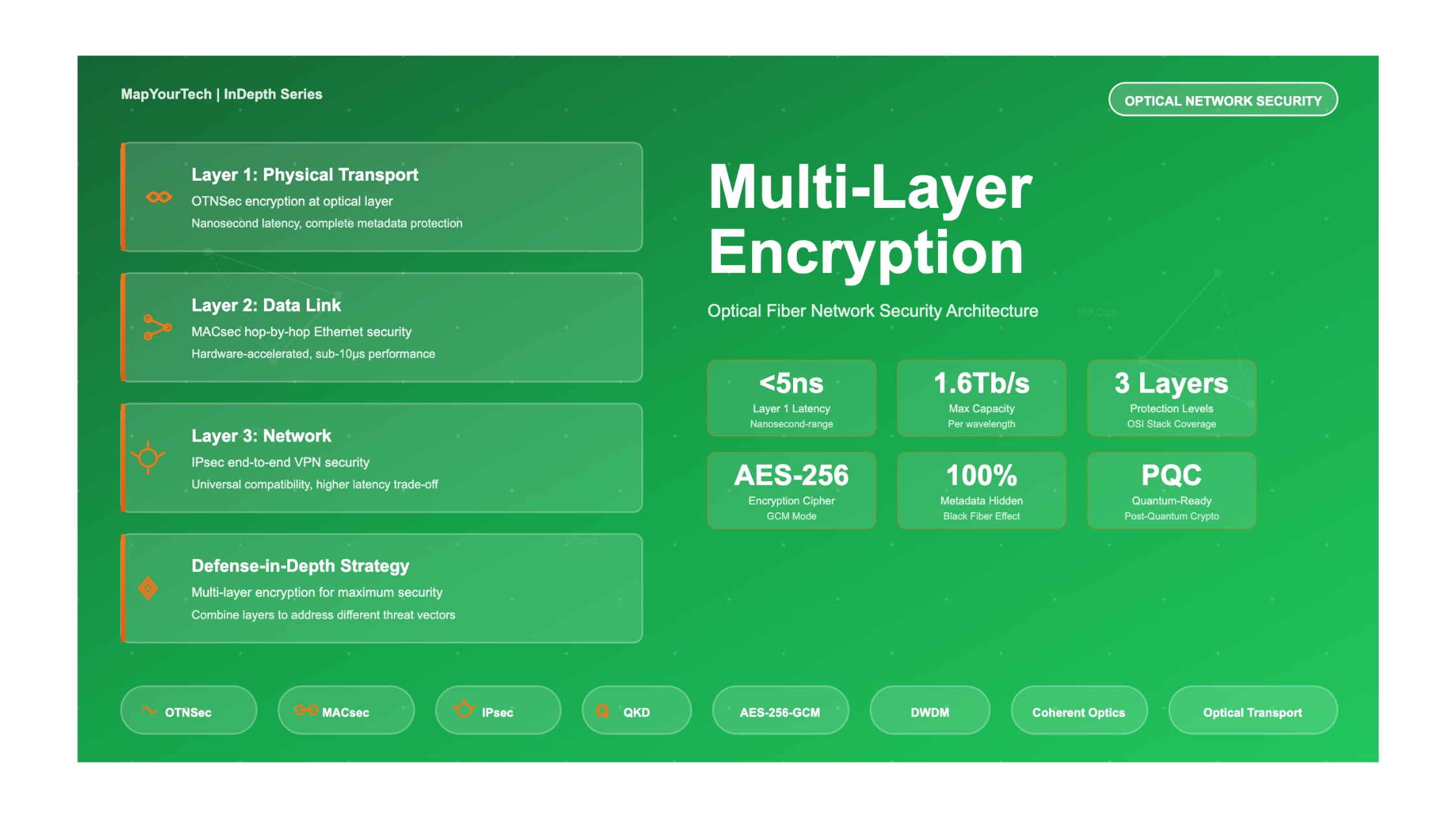 OSI Model and Encryption Layer Placement Strategic positioning of encryption mechanisms across network layers OSI Model Layers Layer 7 - Application HTTP, FTP, SMTP, DNS Layer 6 - Presentation SSL/TLS, Encryption, Compression Layer 5 - Session Session Management, Authentication Layer 4 - Transport TCP, UDP, Port Numbers Layer 3 - Network IP Routing, IPsec VPN IPsec Encryption Layer 2 - Data Link Ethernet, MAC Addressing MACsec (IEEE 802.1AE) Layer 1 - Physical/Transport Optical Transmission, OTN OTNSec / Layer 1 Encryption Security Coverage IPsec Coverage End-to-end IP packet encryption Exposes outer IP headers 100-500+ μs latency MACsec Coverage Hop-by-hop Ethernet frame encryption Exposes MAC headers <10 μs latency OTNSec Coverage Complete payload + metadata encryption "Black fiber" - zero visibility Nanosecond-range latency Strategic Implementation Guidance Layer 1 (OTNSec) Use for: High-speed DCI, financial networks, government backbones Zero latency, complete security Layer 2 (MACsec) Use for: Campus/metro Ethernet Low latency, hardware-accelerated Point-to-point security Layer 3 (IPsec) Use for: VPNs over internet End-to-end over untrusted nets Higher latency acceptable