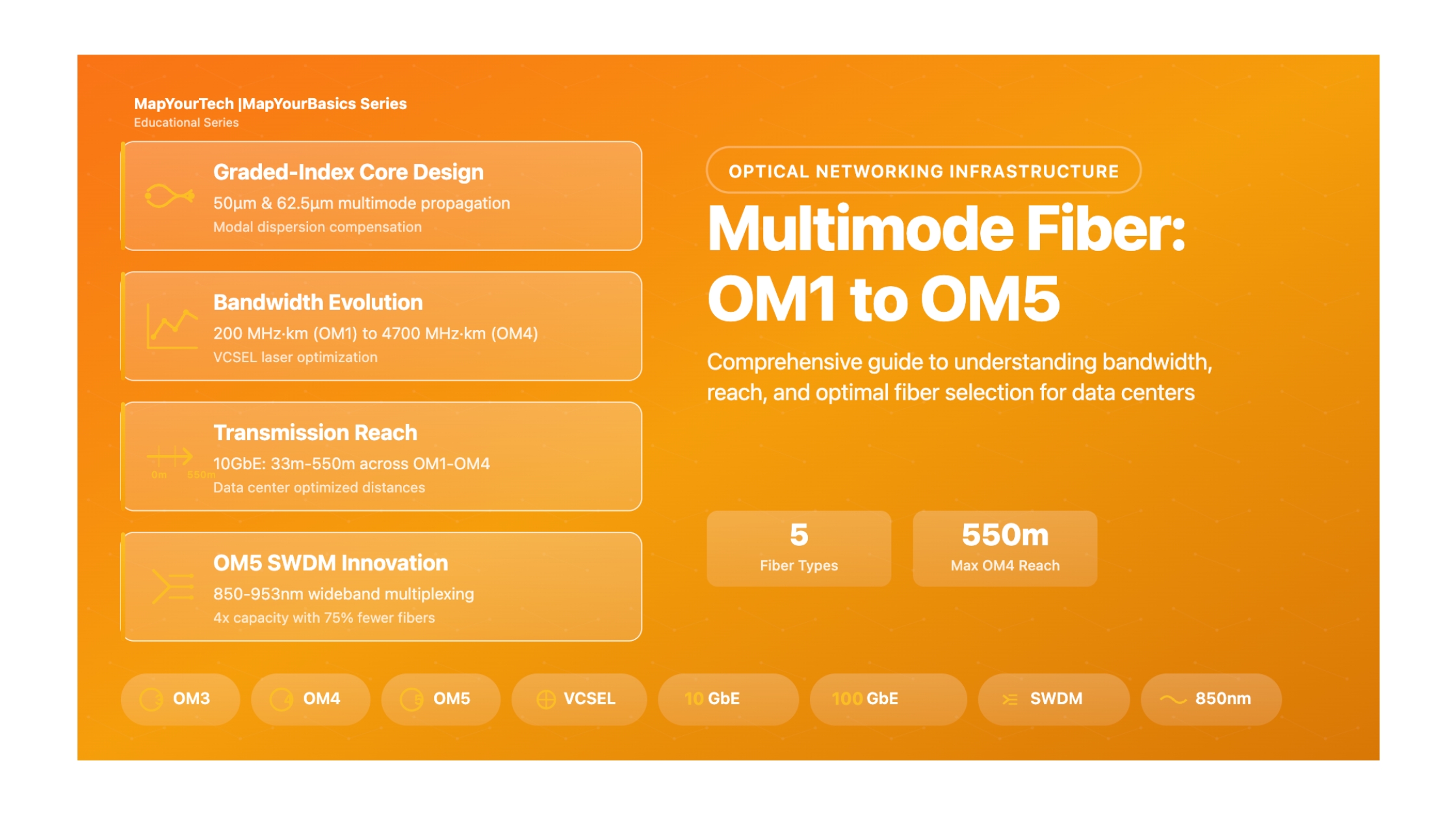Multimode fiber encompasses five primary classifications (OM1 through OM5), each with distinct specifications, performance characteristics, and optimal applications.
