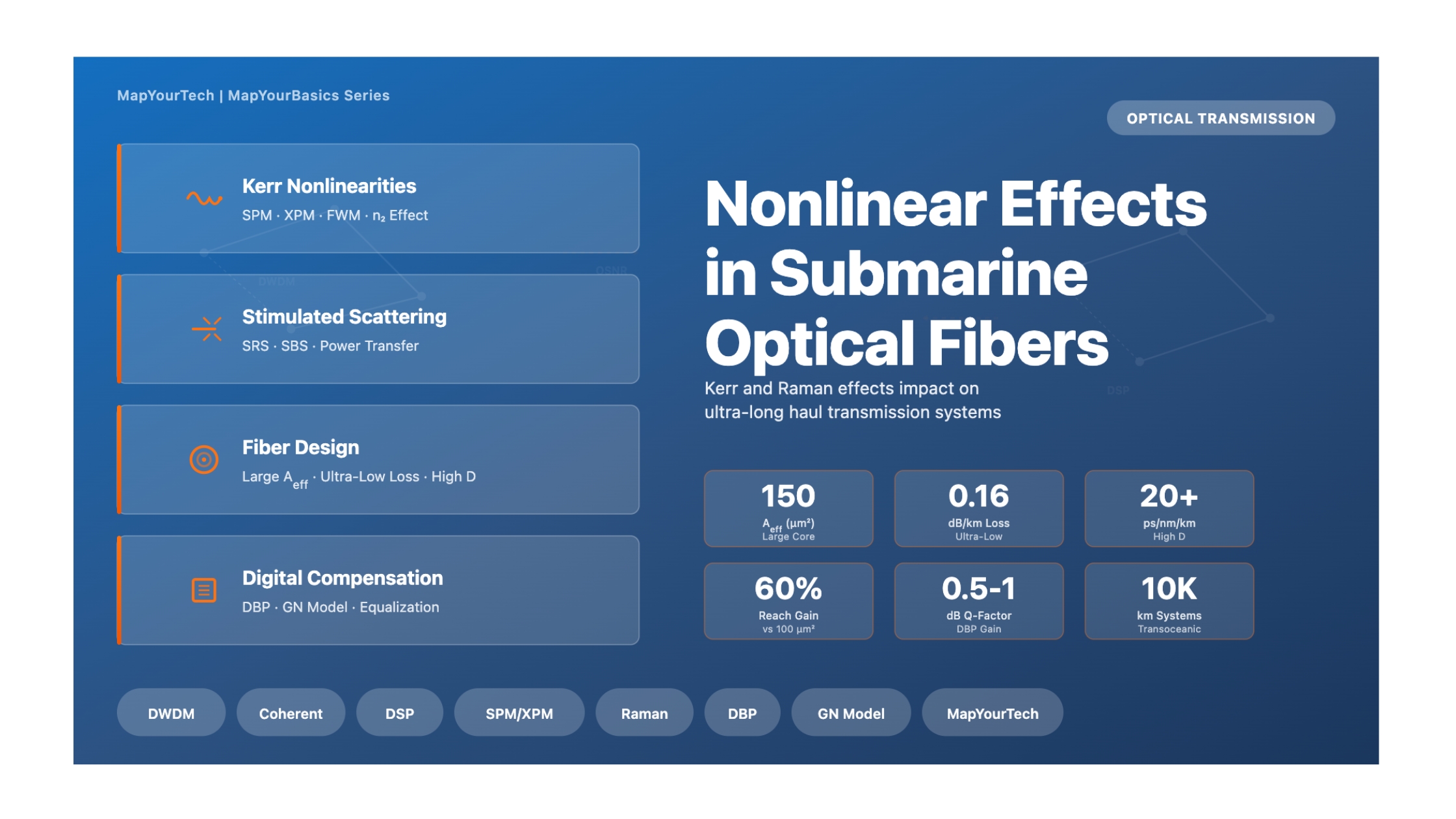 Although the nonlinear coefficient is extremely small, its effects accumulate significantly over the multi-thousand kilometer transmission distances typical of submarine systems. The confined optical power within the small fiber core (characterized by effective area Aeff typically ranging from 80 to 150 μm²) combined with moderate launch powers of approximately 0 dBm per channel creates sufficient intensity to produce measurable nonlinear distortions.