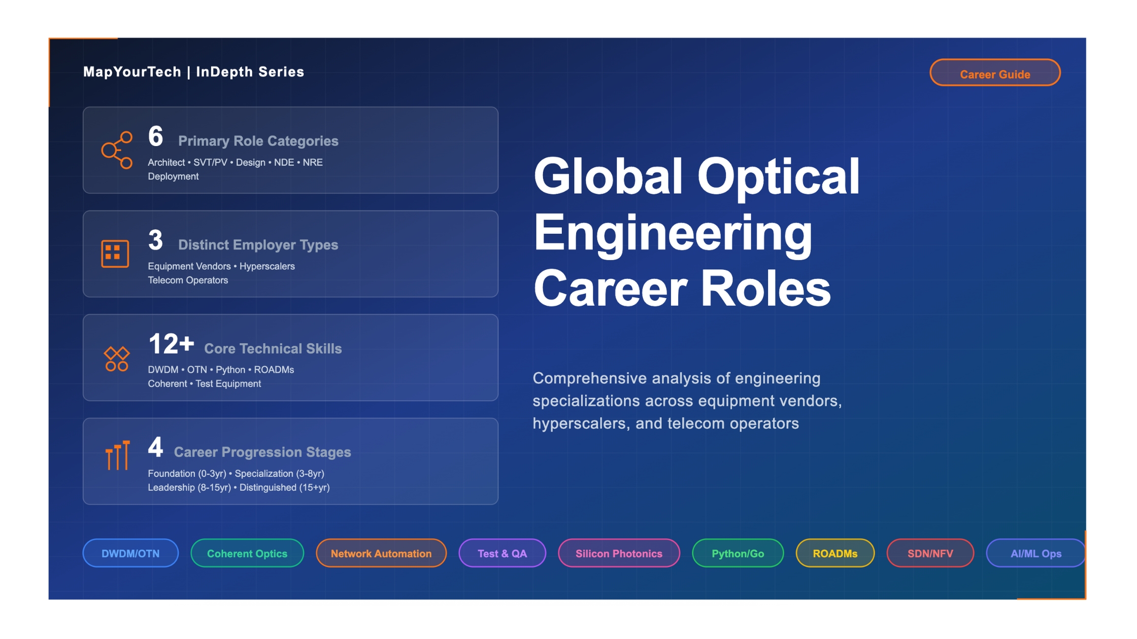 About This Guide: This comprehensive analysis is designed to help aspiring and early-career professionals understand the diverse landscape of optical networking careers worldwide. The roles, responsibilities, compensation ranges, and experience requirements outlined here represent general industry trends and may vary significantly based on geographic location, company size, specific employer, and individual qualifications.
