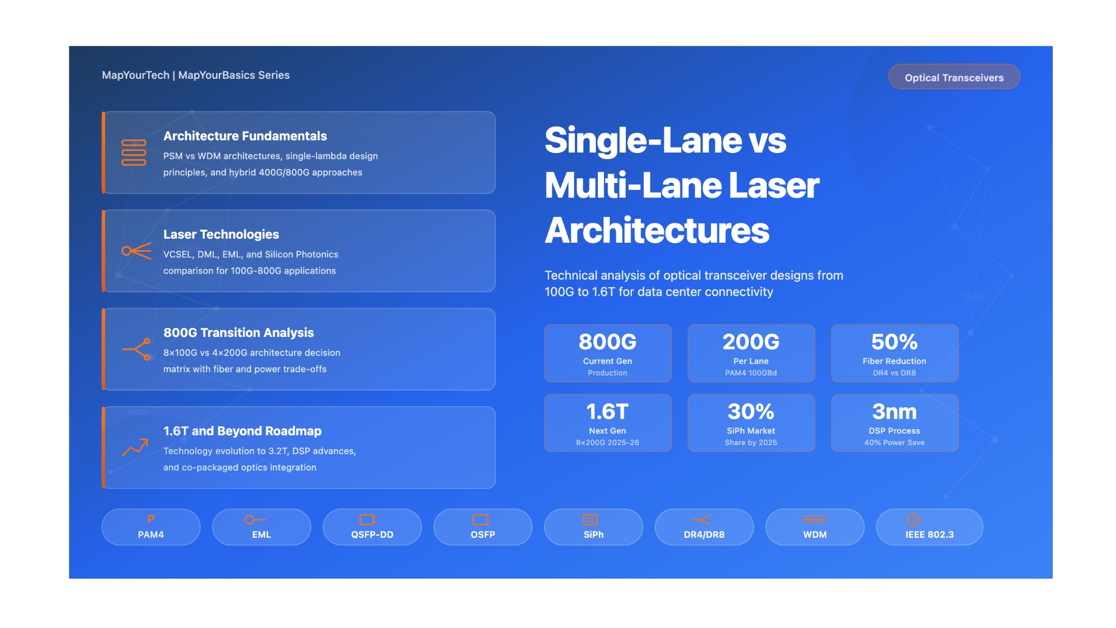 To make informed decisions about single-lane versus multi-lane architectures, engineers must understand the component technologies, signal processing requirements, and system-level implications of each approach. This section examines the building blocks of modern optical transceivers and how they combine in different architectural configurations.