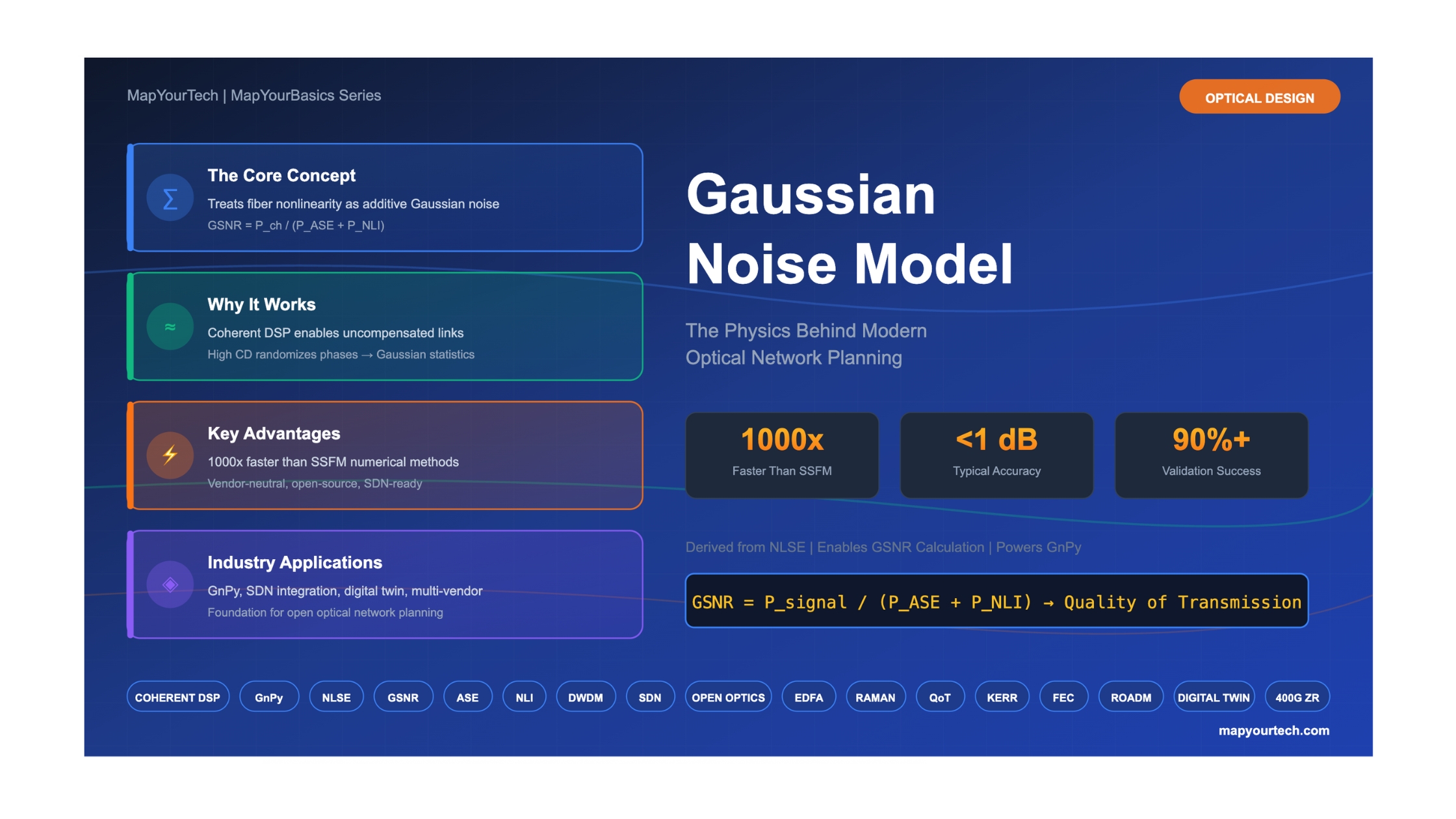 Modern optical networks face a fundamental challenge: accurately predicting transmission performance across complex, multi-span fiber links while maintaining computational efficiency for real-time network management. The Gaussian Noise model emerged as the solution to this challenge, providing network operators with a practical yet sufficiently accurate tool for physical layer modeling.