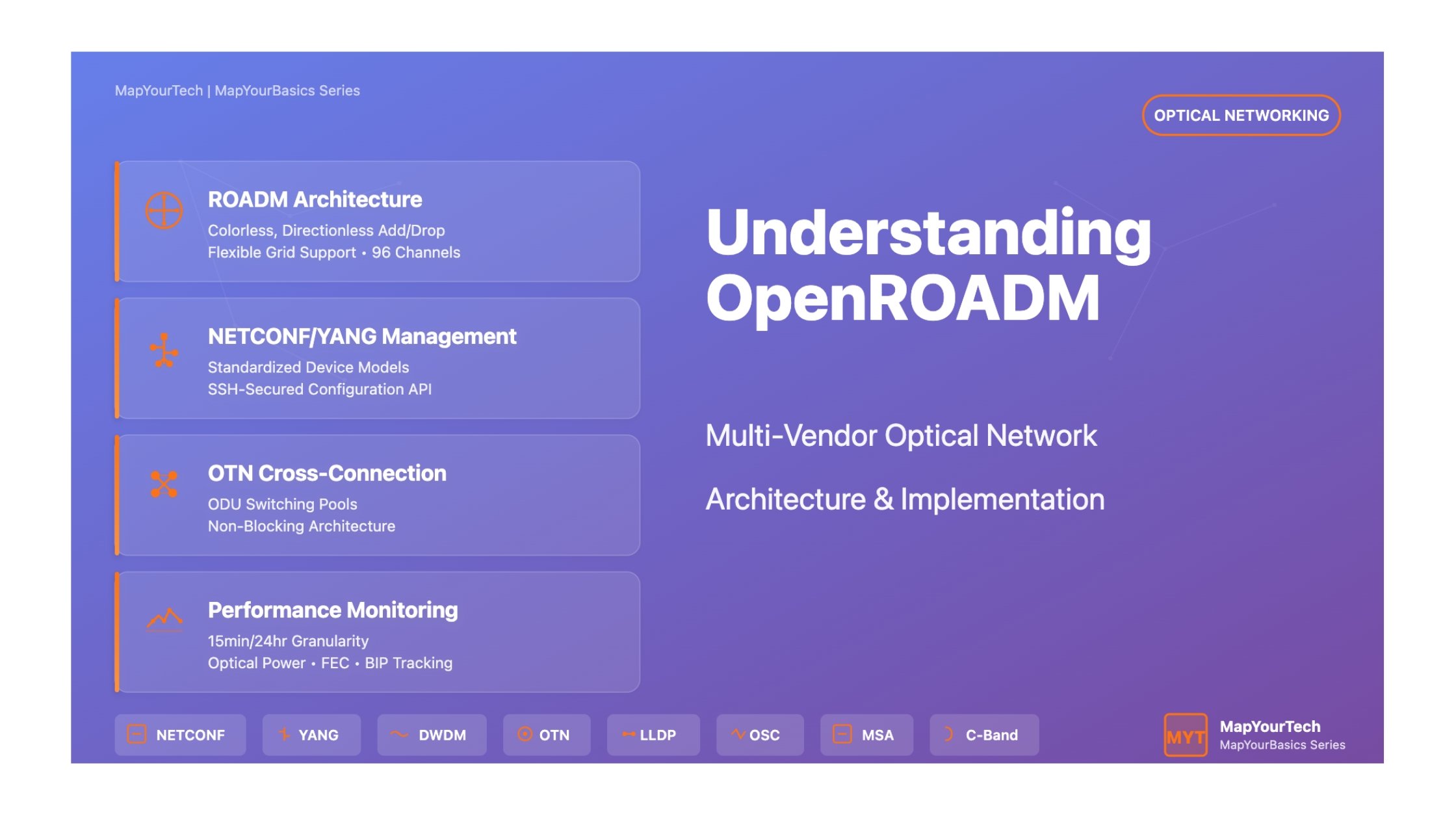 The OpenROADM MSA defines standardized optical interfaces, YANG-based device models, and management protocols that enable network operators to deploy multi-vendor optical networks with confidence. By establishing clear specifications for wavelength division multiplexing (WDM) equipment, OpenROADM facilitates the creation of truly open, disaggregated optical networks where components from different manufacturers can work seamlessly together.